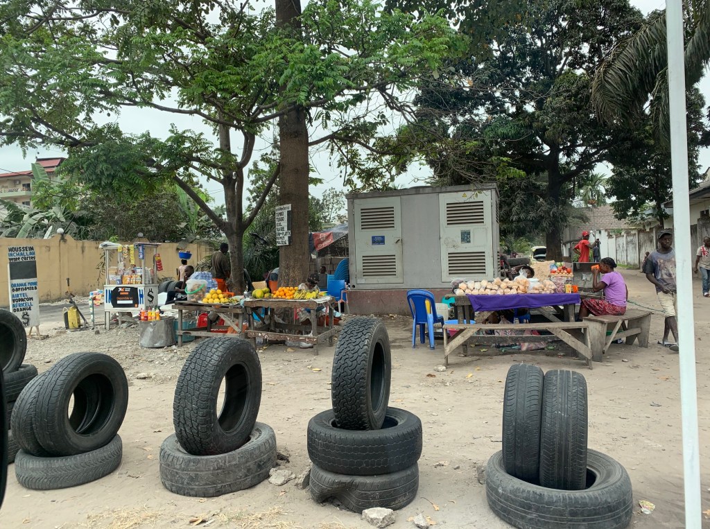 Our first week has been rich in new sights, sounds, other sensations. Our introduction to Kinshasa was immediate–the drive from the airport in the dark, at 6:30 in the evening. Traffic is madly chaotic; all rules of the road are mere suggestions. It’s literally like the bumper cars, going in all directions at once. And the first car that crowds into an intersection or lane has the advantage, and believe me, they take the advantage with boldness that can be frightening to new eyes. Courtesy among drivers is selective and must work according to a subtle code; I can never tell when our driver will yield to another or when he will bolt ahead.